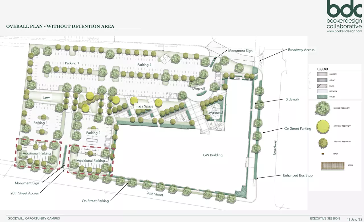 The twenty-acre Goodwill Opportunity Campus is in West Louisville and includes Goodwill Opportunity Center and Norton West Louisville Hospital. BDC worked with MKSK toward a campus master plan with an emphasis on pedestrian connectivity between the two buildings that would reinforce a sense of campus identity. The design was inspired by angular forms of Goodwill’s building designed by Studio A. The site design accommodated programmatic needs including an entrance plaza, areas to gather outside, and a playground. Our role continued into construction documentation and construction observation under the construction manager, Brown E&C Services. We worked closely with Land Design and Development, the civil engineering firm for the project.