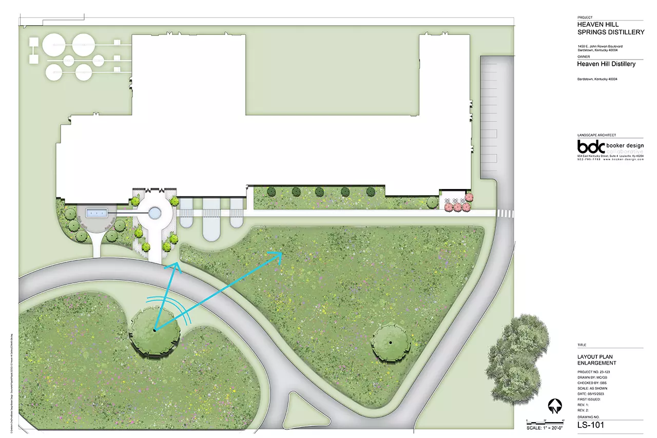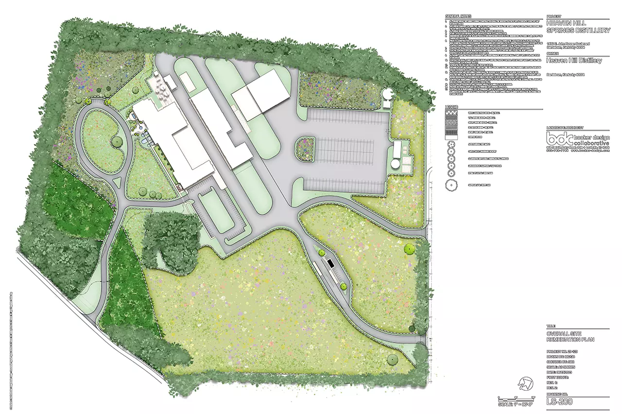 Heaven Hill Brands retained BDC to create a campus landscape master plan for a new Heaven Hill Distillery in Bardstown Kentucky that highlights the natural beauty of rural Kentucky and it’s connection to bourbon production. The new distillery (a working industrial facility and visitor experience) was actively under construction during the master planning process and in many respects a blank slate. Our team worked closely with Heaven Hill to create a Master Plan highlighting the Bluegrass state including rolling agricultural fields, wooded hillsides, and tall grass meadows. Special design consideration was paid to the front entrance where reflecting pools, an entry plaza, and small garden space were designed to enhance the visitor experience using materials native to Kentucky.